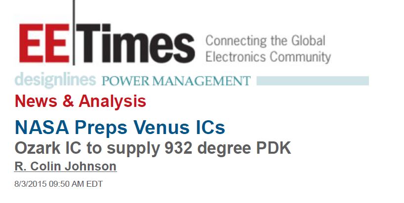 August 3, 2015April 9, 2020Uncategorized Press: Ozark IC Venus-focused R&D Featured in EETimes NASA Preps Venus ICs. Ozark IC to supply 932 degree PDK. R. Colin Johnson. 8/3/2015 09:50 AM ED